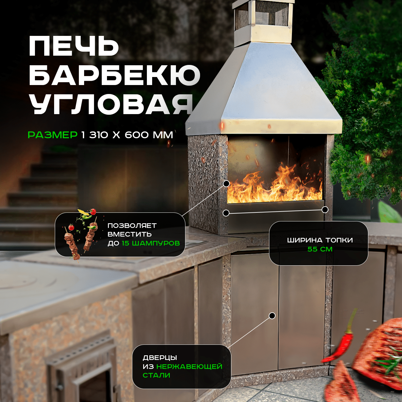 Комплекс включает печь под казан, разделочный стол, угловую печь барбекю (топка 55 см) и стол с мойкой, предлагая все необходимое для наслаждения приготовлением еды на открытом воздухе.